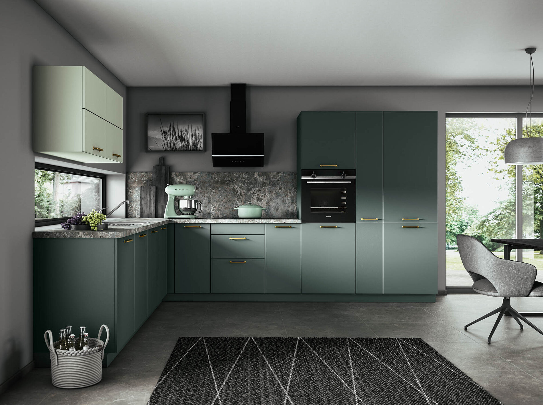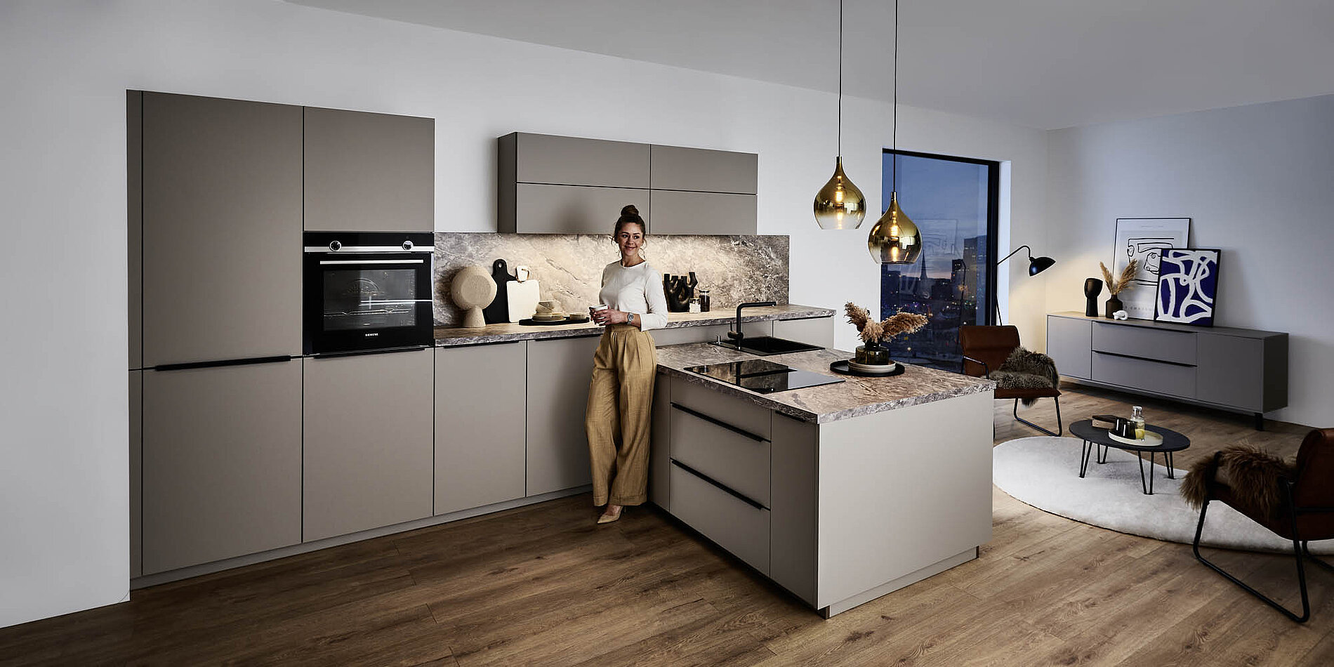 Kühle, edle Oberflächen wie Glas, Stein oder Edelstahl werden mit warmen Holznuancen kombiniert. Jeder Griff über die Arbeitsplatte erzählt von Qualität, jede Front wirkt wie ein Möbelstück, das sich harmonisch in den Raum einfügt.